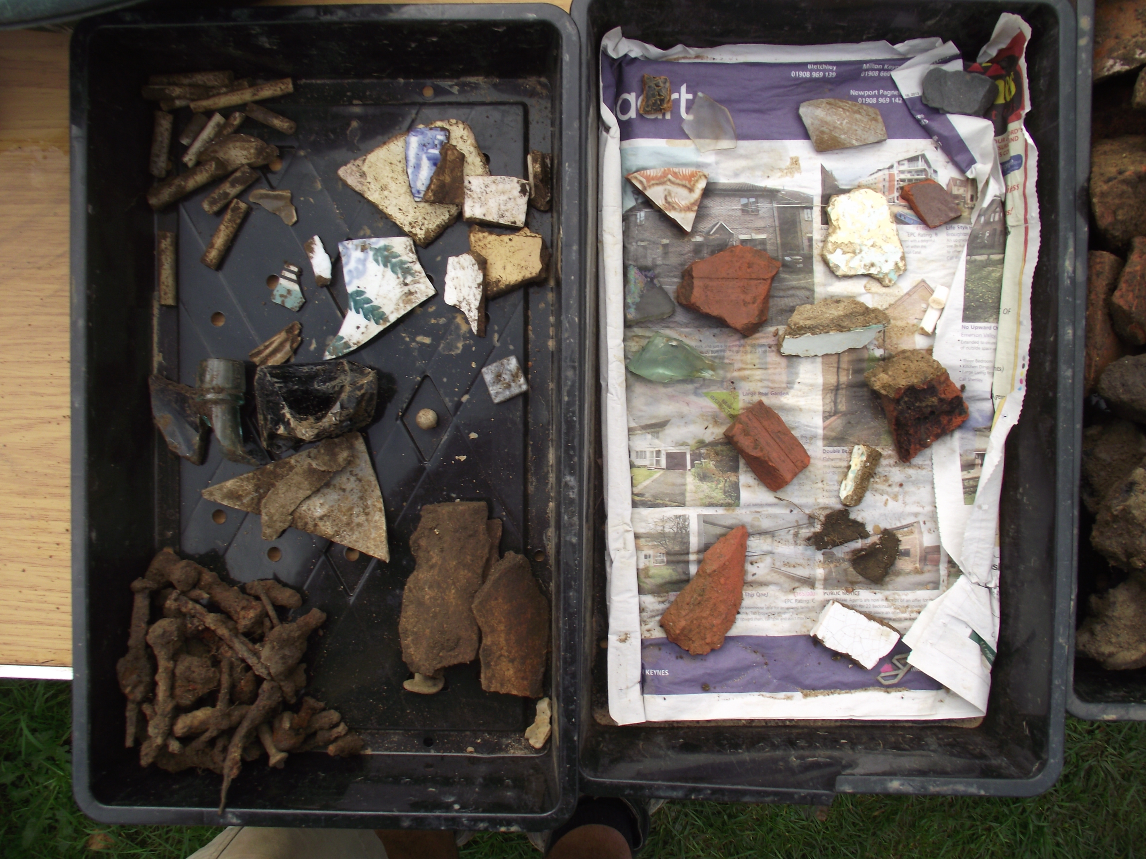 A modern topsoil containing modern pottery, glass, brick and animal bone overlay an earlier topsoil deposit containing clay pipe stems, tiles and Victorian pottery. Sadly the test pit was located over the top of a modern pit filled with builders rubble and only a small portion of the test pit was unaffected. The area unaffected by the modern pit contained a subsoil below the topsoil layers, which suggests the test pit is located outside of the boundary of the cemetery. Sadly we didn’t find any medieval pottery but the test pit does prove that the boundary ditch we were searching for was located closer to the church.
