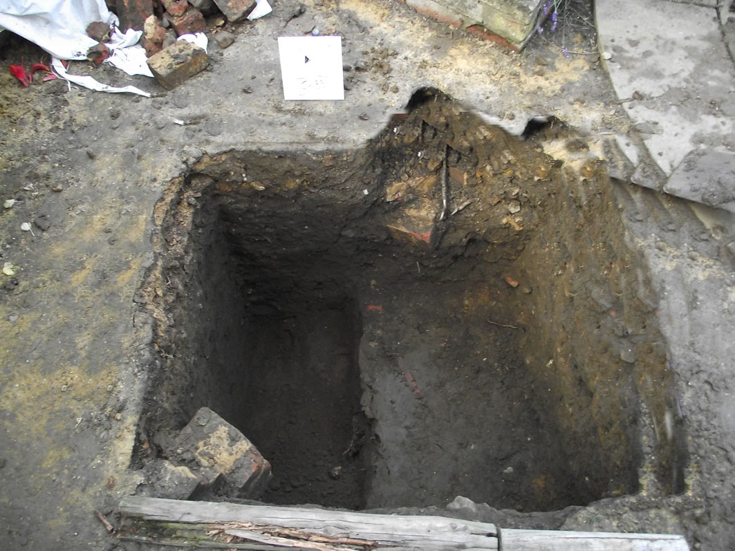 Topsoil overlay a dark garden soil which contained an assemblage of pottery of differing ages, some animal bone and clay pipe stems. We discovered a brick wall very early on which ran diagonally across the test pit. Once below the last bricks, we were able to remove the wall and continue down. We think the wall once formed a garden feature and was probably 19th-20th century in date. Sadly the wall restricted our progress and we weren’t able to go as deep as we hoped, but an assemblage of medieval pottery was recovered from both made ground deposits within TP5, dating to 900-1600. The assemblage suggests that there has been continuous habitation on the site from the late Saxon period onwards.